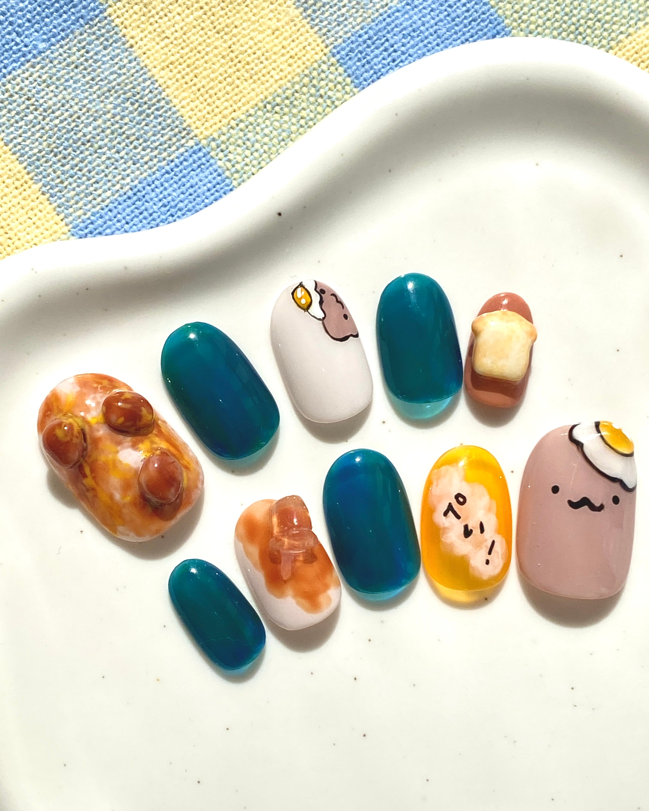 ぎゅうちゃん、納豆ねば〜、甘エビ卵色、 コーヒーびちゃ、パンのネイルチップ! 食品サンプル雑貨作家kanapeiさんとおそろいです◎ 購入、備考欄へサイズの入力をお願いします。 ※サイズの記載が無いお客様へは、「ラウンドショート」の「Mサイズ」でお作りいたします。